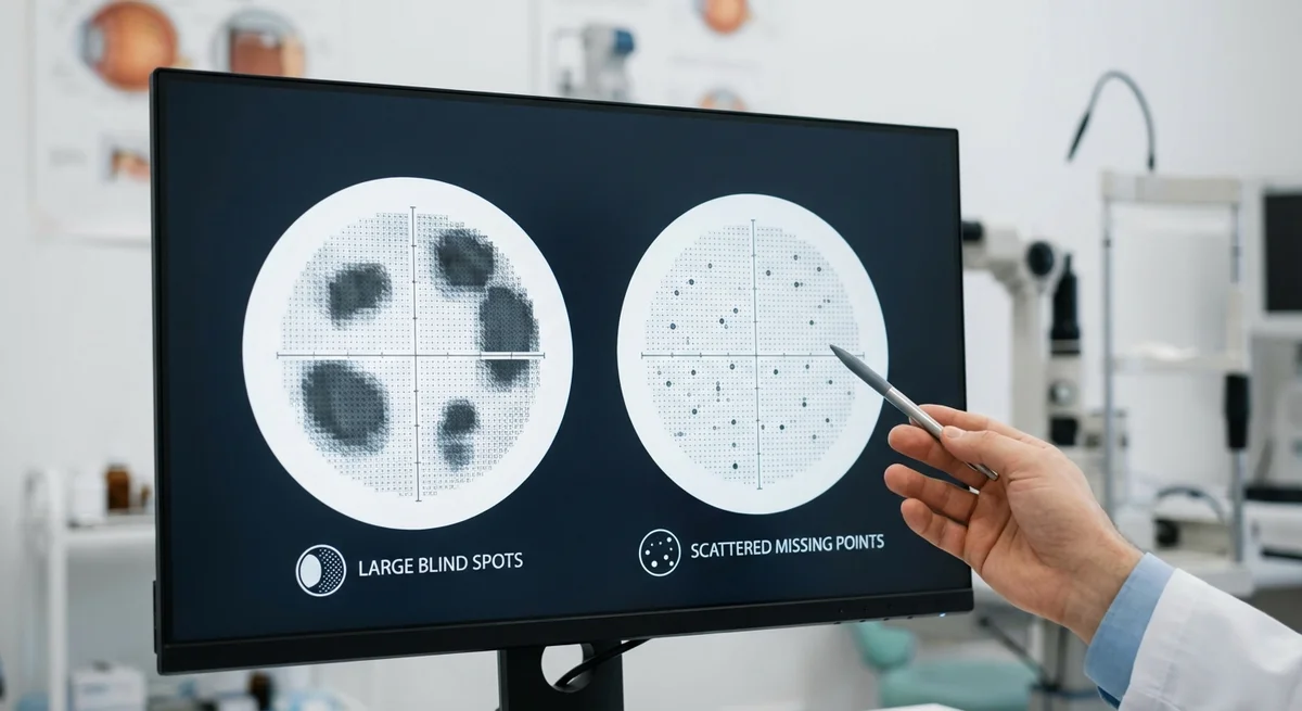 æ£è ã«ãšã£ãŠã¯ãèªåã®æ€æ»ã倱ãããèŠéã®æç¹ã瀺ãã®ãããããšãå€ãã®å°ããªæ¬ æã瀺ãã®ããèªèããããšããæåŸ å€ãèšå®ããäžã§åœ¹ç«ã¡ãŸããèšåºå»ã«ãšã£ãŠã¯ãäŸãã°æ°ããäžå¿æ§ãŸãã¯éŒ»åŽæ§æå€±ããã°ãã°ããç¶¿å¯ãªèª¿æ»ãåŒãèµ·ãããªã©ãã¢ãã¿ãªã³ã°ã調æŽããã®ã«åœ¹ç«ã¡ãŸã (pmc.ncbi.nlm.nih.gov) (www.nature.com)ãçµå±ã®ãšããããã¿ãŒã³ã«é¢ä¿ãªããç®æšã¯åãã§ããå¯èœãªéãå€ãã®èŠåãç¶æããããšã§ããèŠéãã¹ã€ã¹ããŒãºã®ããã§ããããšãããã€ãã®å€§ããªç©ŽãããããšãçŒå§ãäœãä¿ã¡ãç¶²èç¥çµç·ç¶ãå¥åº·ã«ä¿ã€ããšãéèŠã§ãã忣è ã®èŠéæ¬ æãã¿ãŒã³ãç åãšé²è¡ãšé¢é£ä»ããããšã§ãå»åž«ã¯ç·å éãã©ã®ããã«é²è¡ããããããæ£ç¢ºã«äºæž¬ã§ããŸããæ£è ã¯ããã®çè§£ãçšããŠèŠéæ€æ»ã®çµæãçè§£ããèªèº«ã®æ²»çã«ãããŠæ å ±ã«åºã¥ããããŒãããŒã§ããç¶ããããšãã§ããŸãã