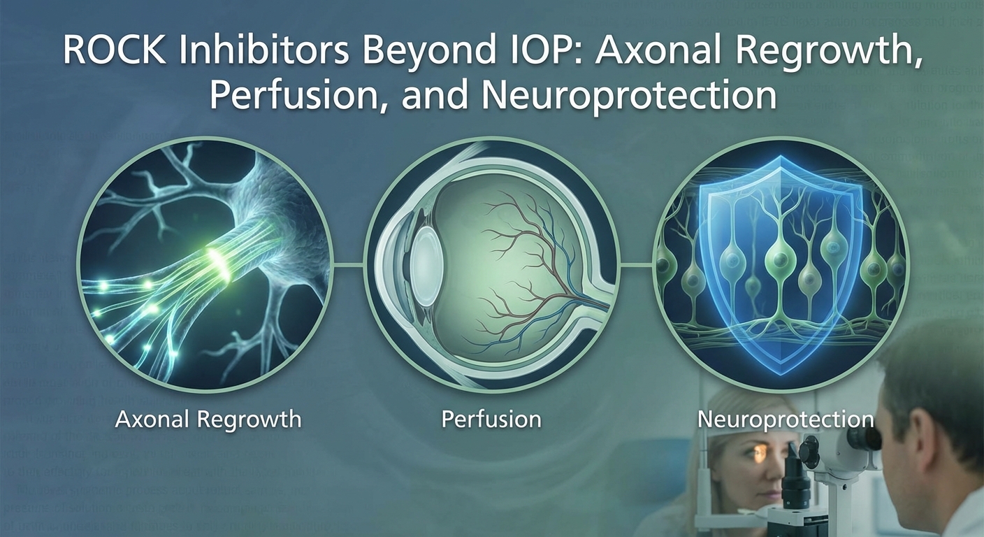 Glaukoma ir redzes nerva slimÄ«ba, ko raksturo tÄ«klenes nervu Ŕūnu (tÄ«klenes ganglija Ŕūnu jeb RGC) zudums un redzes zudums. IntraokulÄrÄ spiediena (IOP) samazinÄÅ”ana ir vienÄ«gais pierÄdÄ«tais veids, kÄ palÄninÄt glaukomas progresÄÅ”anu, taÄu nervu Ŕūnas iet bojÄ arÄ« citu stresu (slikta asinsrite, toksÄ«ni utt.) dÄļ. Rho kinÄzes (ROCK) inhibitori ir jauna glaukomas acu pilienu klase (piemÄram, netarsudils, ripasudils), kas atslÄbina acs drenÄžas kanÄlus, lai samazinÄtu IOP. AizraujoÅ”i, ka laboratorijas pÄtÄ«jumi liecina, ka Ŕīs zÄles var arÄ« aizsargÄt un palÄ«dzÄt atjaunot redzes nerva Ŕķiedras (pmc.ncbi.nlm.nih.gov) (pmc.ncbi.nlm.nih.gov). Citiem vÄrdiem sakot, papildus spiediena samazinÄÅ”anai, ROCK inhibitori var veicinÄt aksonu augÅ”anu, uzlabot redzes nerva asins plÅ«smu un tieÅ”i aizsargÄt RGC. ZemÄk mÄs apkopojam laboratorijas un agrÄ«nos klÄ«niskos atklÄjumus par Ŕīm ietekmÄm, salÄ«dzinÄm netarsudilu un ripasudilu, un apspriežam, kÄ klÄ«niskie pÄtÄ«jumi varÄtu pÄrbaudÄ«t to ar IOP nesaistÄ«tÄs priekÅ”rocÄ«bas.